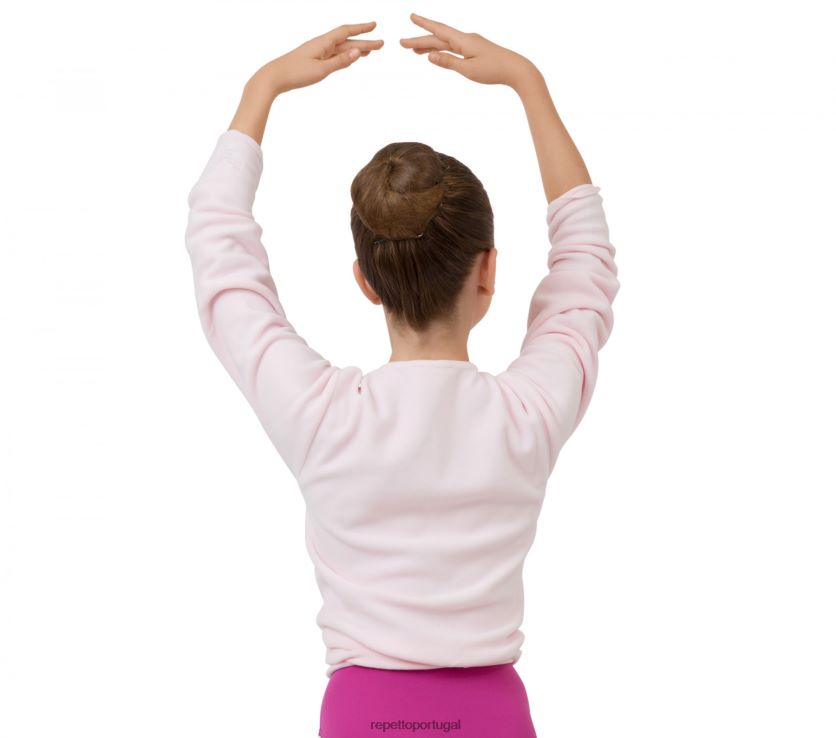 top envolvente rosa claro com mangas compridas para jovem dançarina. ideal para aquecimento. o aquecimento é uma etapa essencial para todos os bailarinos, independentemente do seu nível de dança, os nossos artigos de aquecimento são confortáveis ​​e oferecem uma excelente proteção térmica. cordões para dar nó na lateral, decote em V. logotipo repetto bordado na manga em tons combinando.