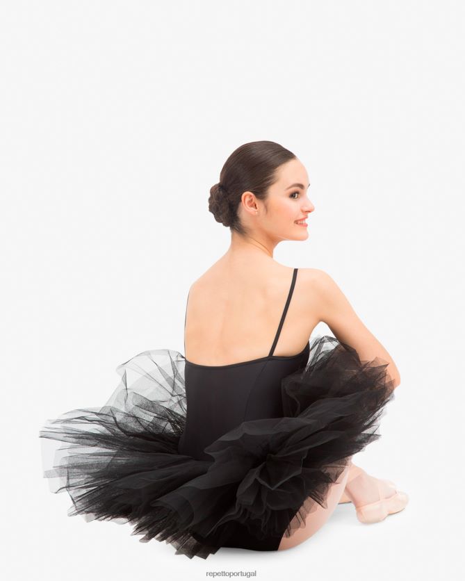 o tutu de prato feminino é feito de 6 camadas de tule rígido. o estilo espartilho em lycra e a costura princesa enfatizam a silhueta da bailarina. as alças finas e o decote redondo ultrapassam a parte superior do corpo. também pode ser base para figurinos de palco mais elaborados. este modelo possui forro frontal. transferência transparente do logotipo do repetto nas costas.