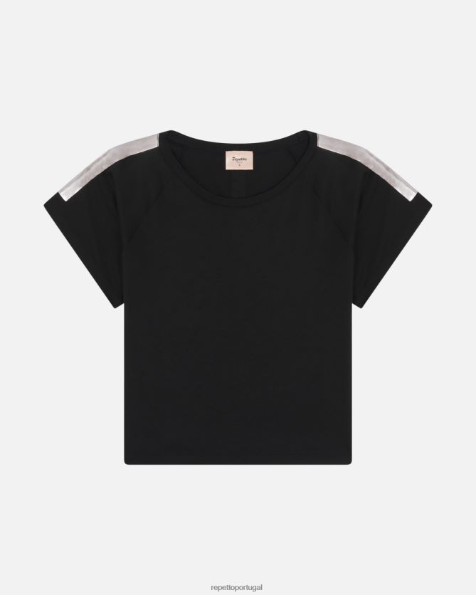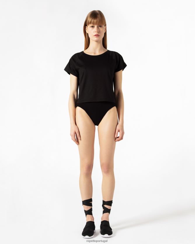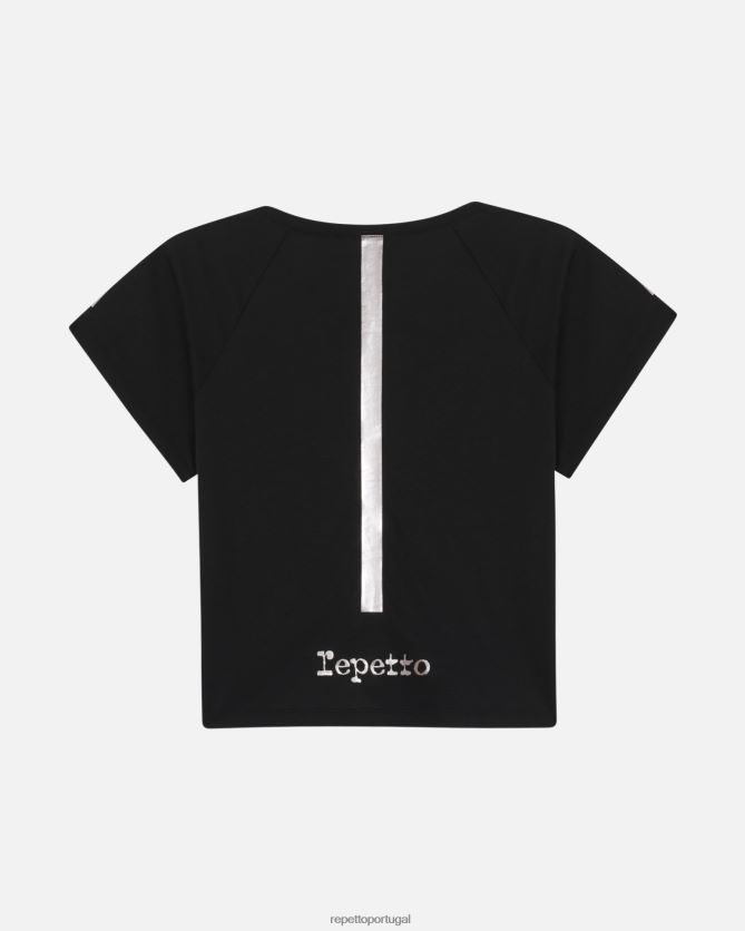 detalhes: top raglan de manga curta. decote redondo. forma quadrada. faixa com efeito pérola e logo repetto.